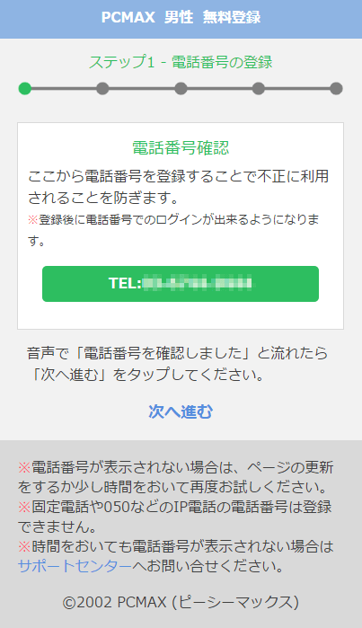 自動応答の音声ガイダンスから「電話番号の確認が完了しました」と返答がありましたら『次へ進む』をタップします。